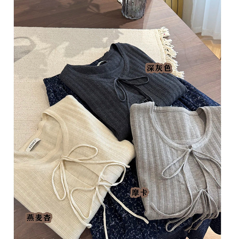 假两件开衫女蝴蝶结圆领毛针织衫燕麦上衣开衫长袖简约半身裙套装#上衣 #开衫 #针织衫 #套装 #女装